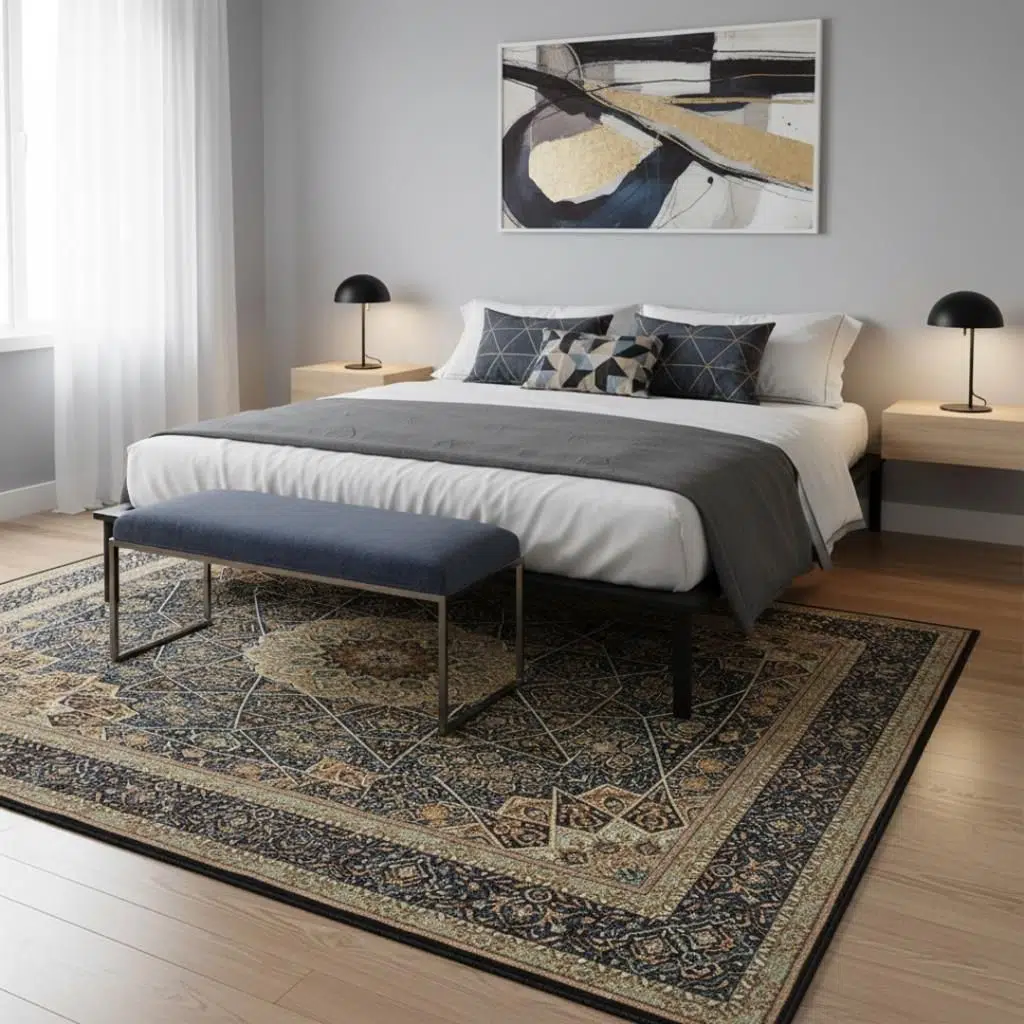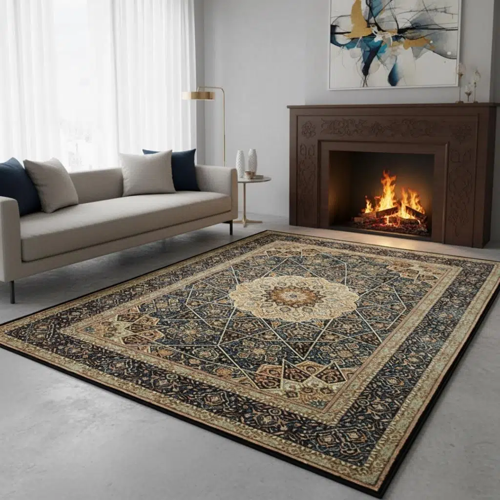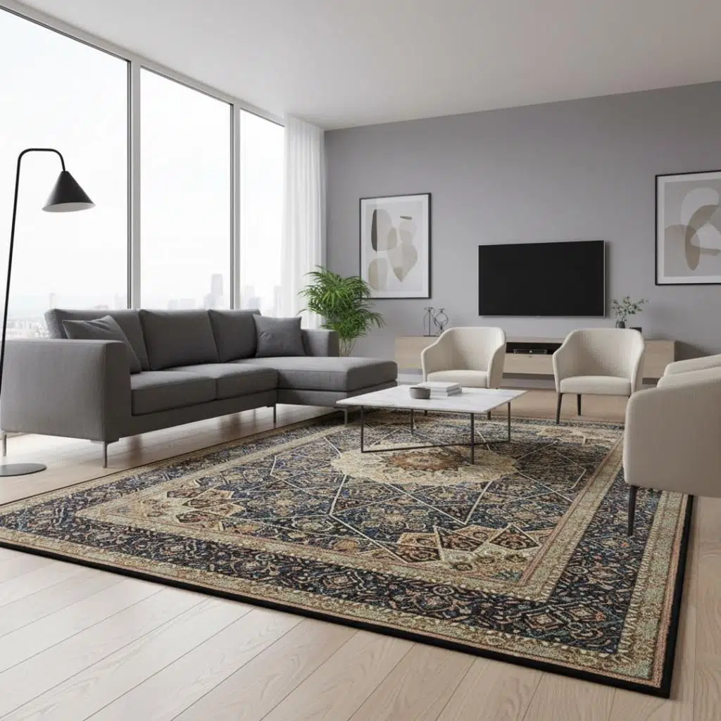 Antik desenli halı, merkezde yer alan detaylı madalyon motifi ve çevresini saran simetrik geometrik çizgilerle klasik estetiği güçlü bir şekilde yansıtır. Antrasit zemin üzerine uygulanan bej ve altın tonları, halıya derinlik kazandırırken mekânda sofistike ve dengeli bir görünüm oluşturur. Klasik madalyon desen anlayışının modern renk geçişleriyle yorumlandığı bu tasarım, hem geleneksel hem de modern dekorasyon stilleriyle uyum sağlar.