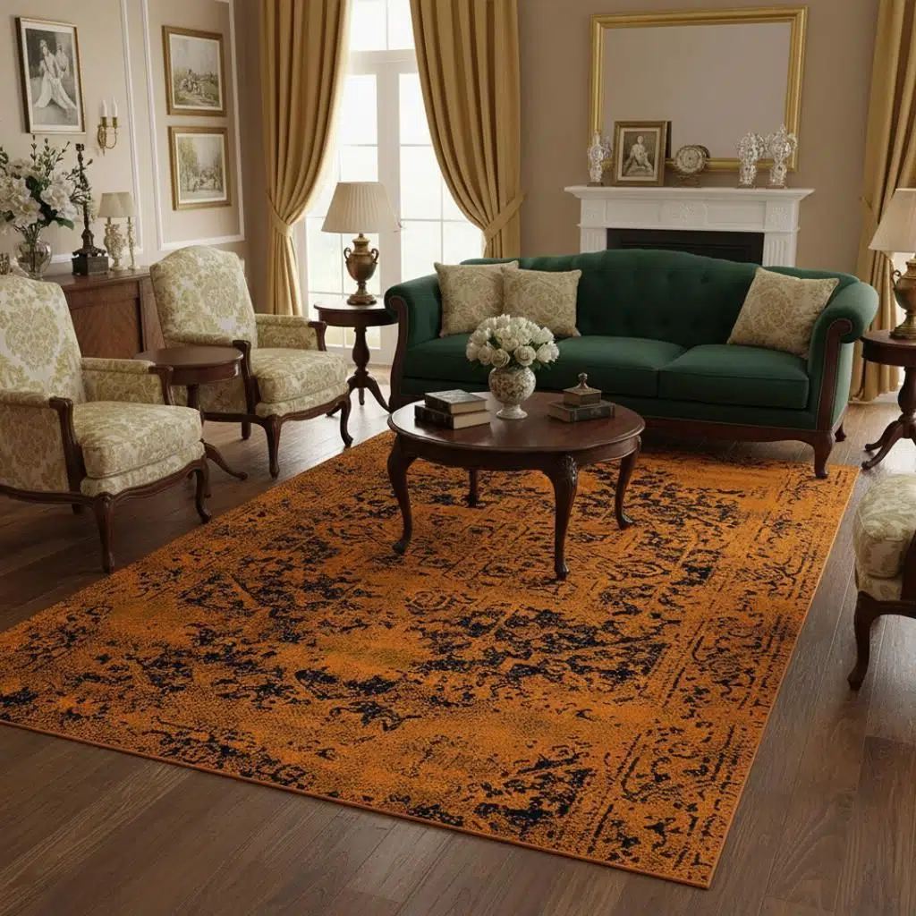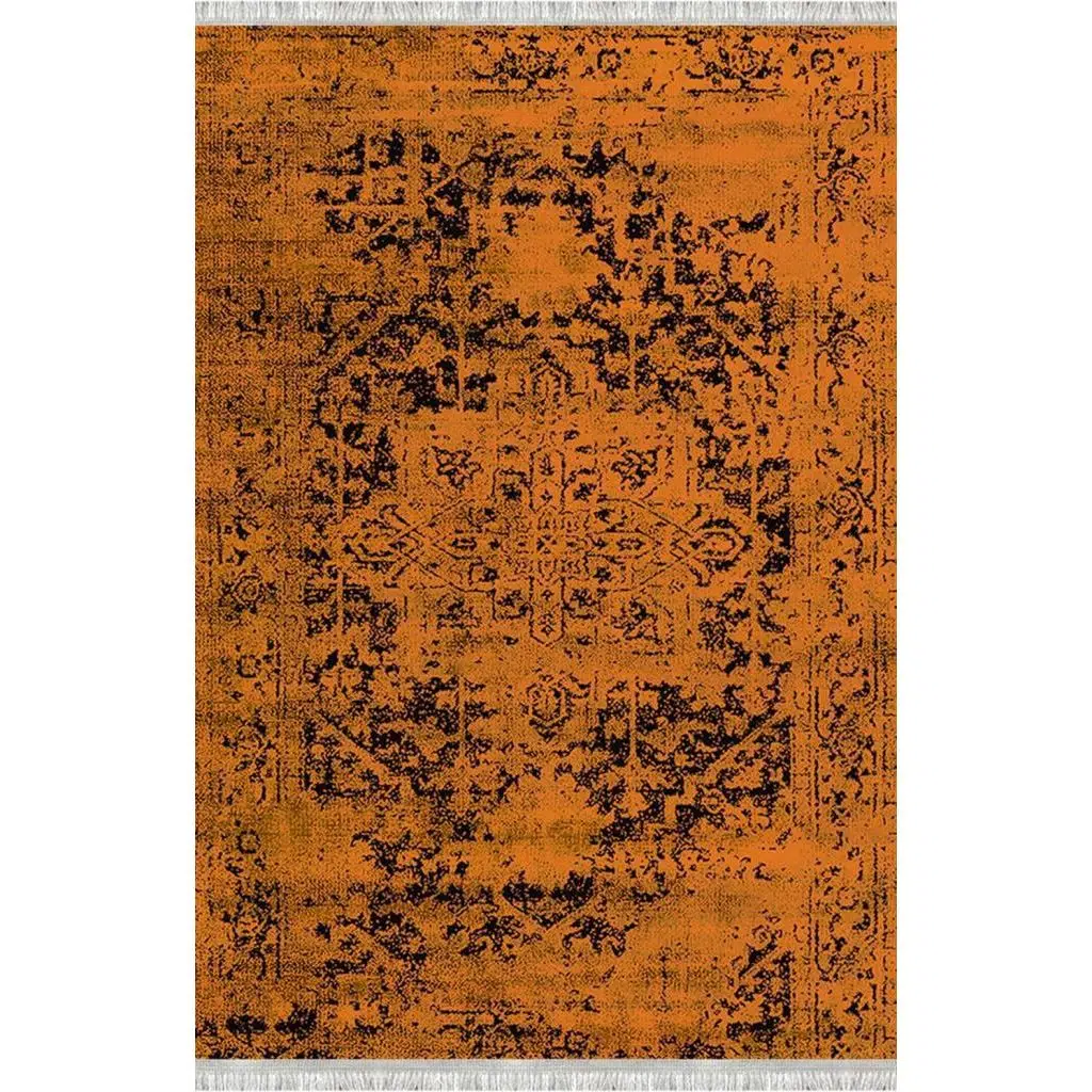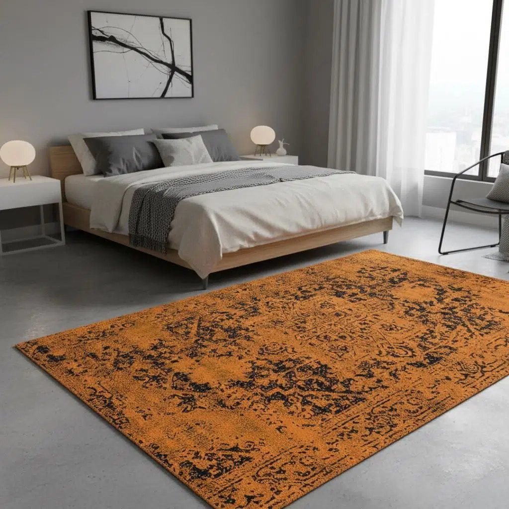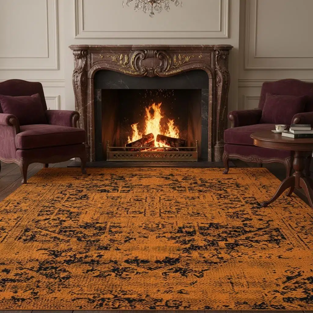 Antik desenli turuncu halı, geleneksel halı motiflerinin vintage eskitme dokusuyla modern bir yorum kazanmasıyla tasarlanmıştır. Turuncunun sıcak ve enerjik tonu, siyah eskitme detaylarla dengelenerek halıya güçlü, karakterli ve dikkat çekici bir görünüm kazandırır. Eskitme efektli desen yapısı sayesinde bu vintage görünümlü halı modeli, hem klasik hem de çağdaş dekorasyon stilleriyle rahatlıkla uyum sağlar.