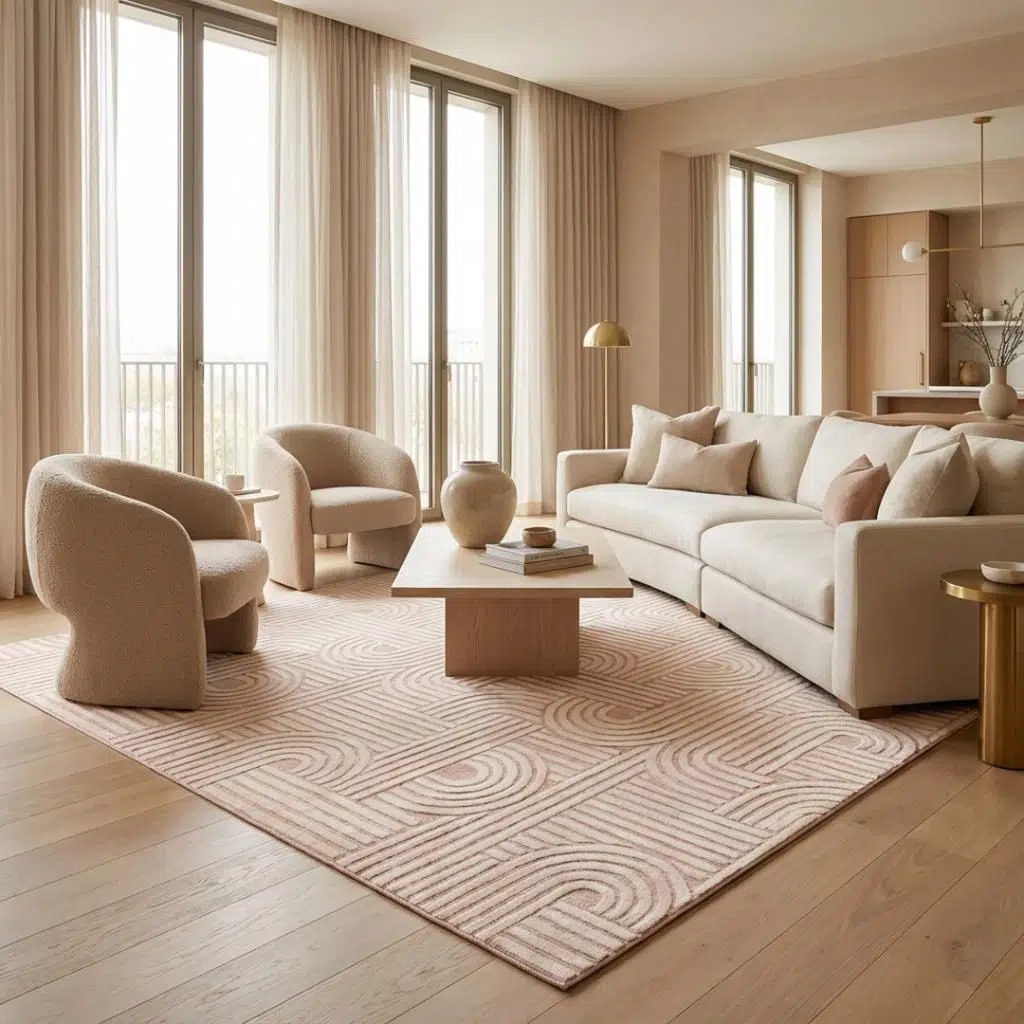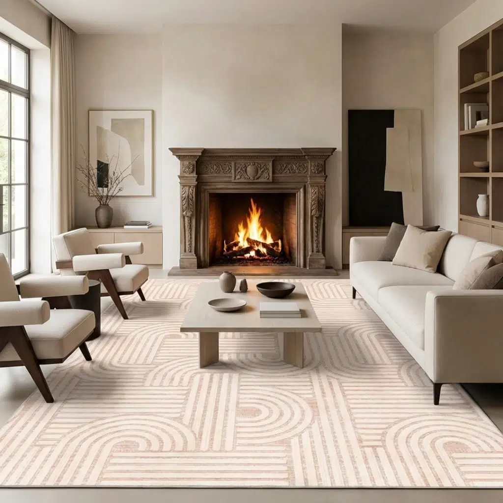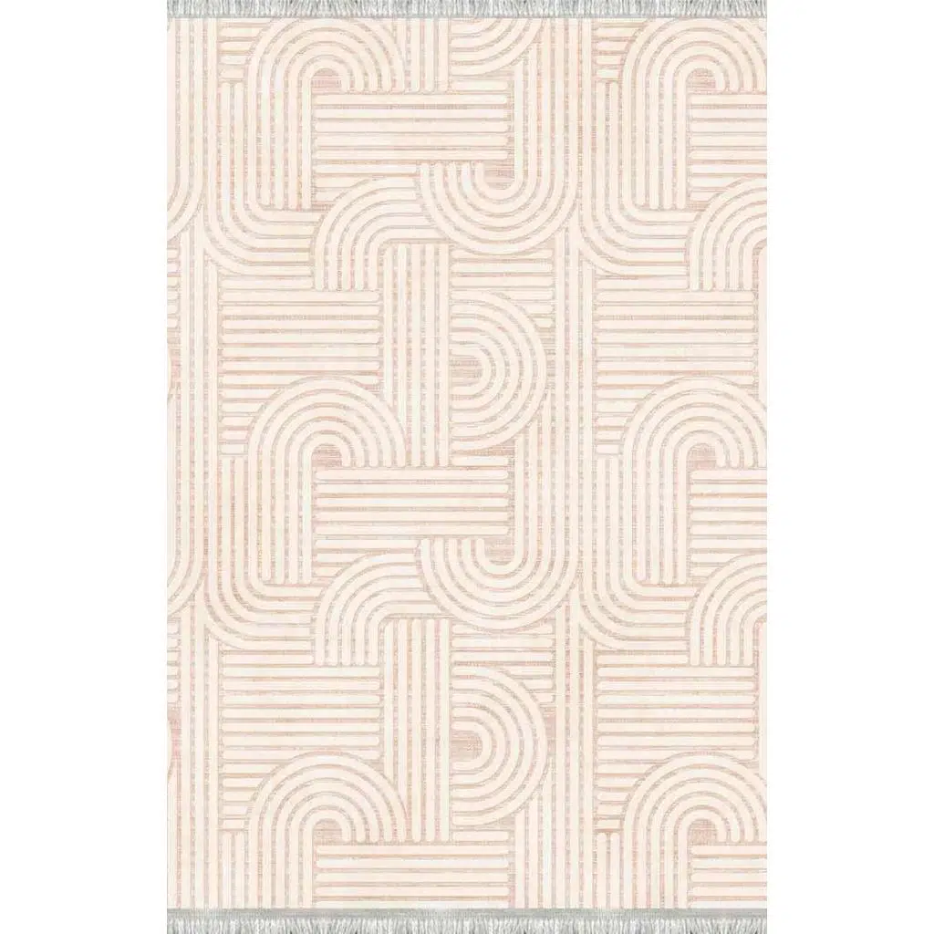 Zamansız bej renk paletiyle hem modern hem minimalist dekorasyon stilleriyle kusursuz uyum sağlayan bu geometrik desenli halı, estetik görünümü fonksiyonel özelliklerle birleştiren uzun ömürlü ve şık bir dekorasyon çözümüdür.