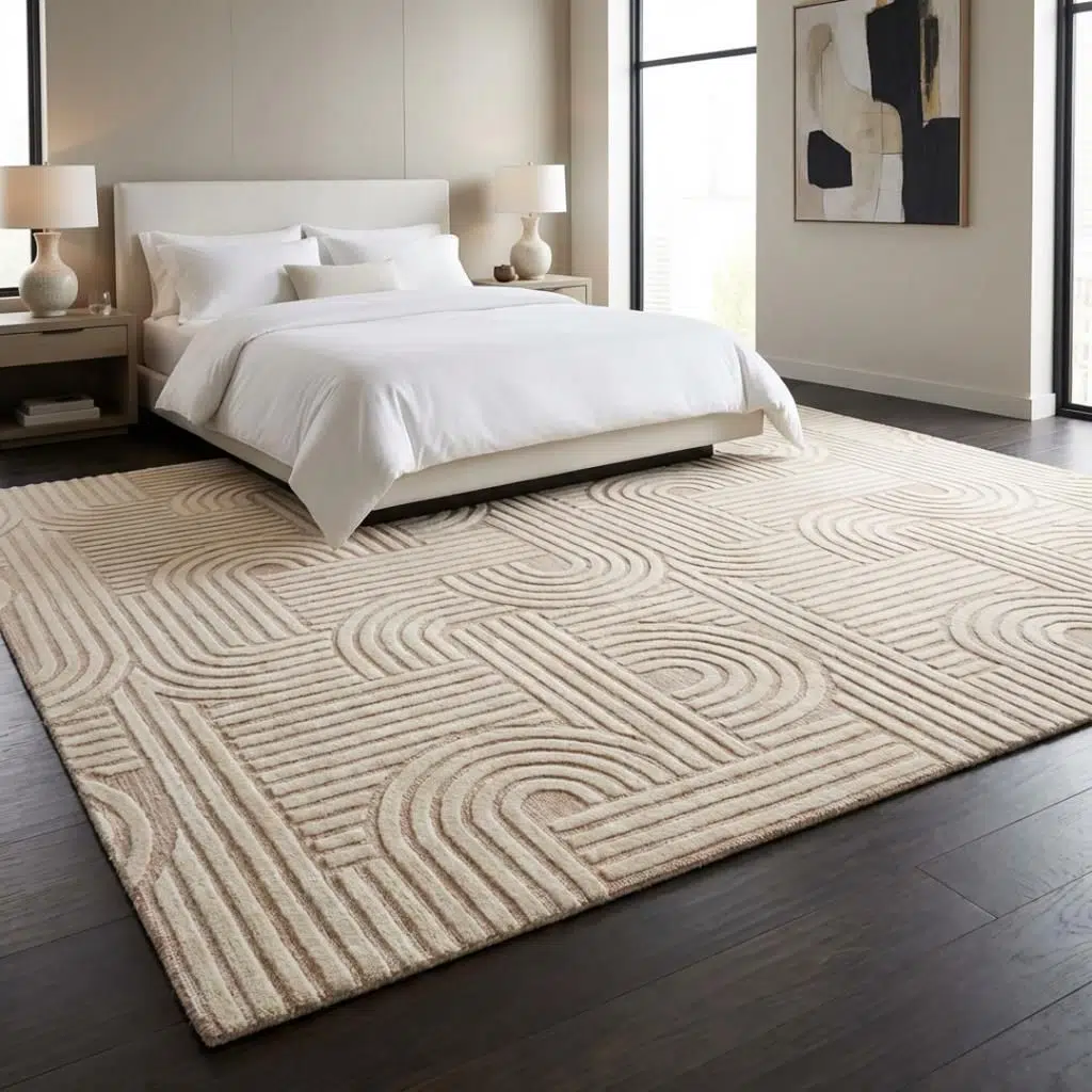 Bej geometrik desenli halı, yumuşak bej tonları ve modern geometrik çizgileriyle yaşam alanlarına ferah, dengeli ve zarif bir görünüm kazandırır. Kavisli ve çizgisel desenlerin uyumlu birleşimi mekâna hareket katarken, sade renk geçişleri sayesinde göz yormayan şık bir atmosfer sunar. Salon, oturma odası, yatak odası ve ofis alanları için ideal bir dekorasyon tamamlayıcısıdır.