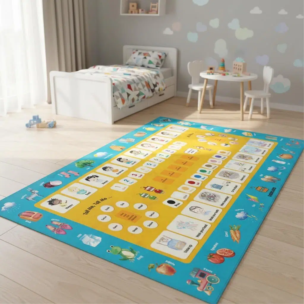 Bu eğitici çocuk halısı, okul öncesi dönemdeki çocukların bilişsel, dil ve duygusal gelişimini desteklemek amacıyla tasarlanmıştır. Halı üzerinde yer alan sayılar, renkler, duygular ve günlük aktiviteler sayesinde çocuklar oyun oynarken öğrenir. Duyguları tanımaya yardımcı görseller, çocukların kendilerini ifade etmelerini kolaylaştırırken; sayılar ve renkler erken matematik ve görsel algı gelişimini destekler. Günlük rutinlere ait sahneler ise çocuklara temel yaşam becerilerini öğretir.