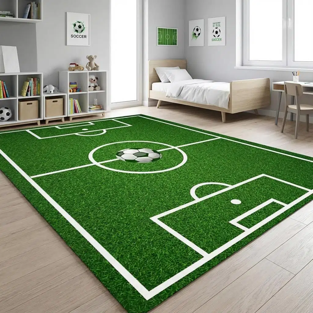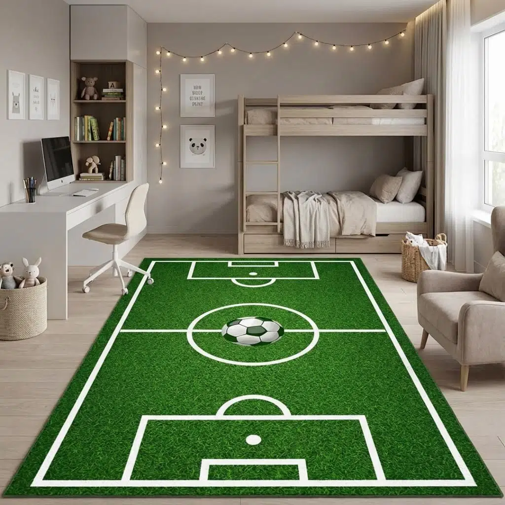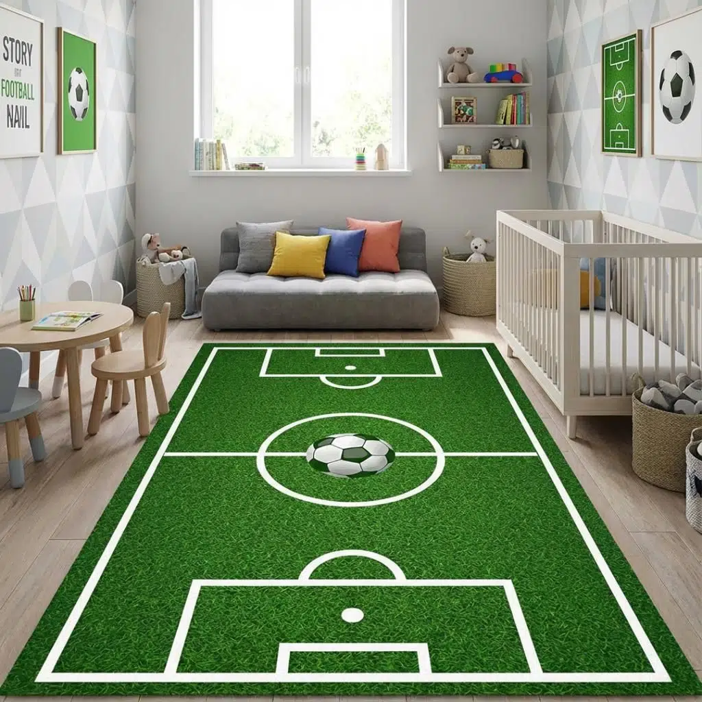 Futbol tutkusunu çocuk odalarına taşıyan bu futbol sahası desenli çocuk halısı, yeşil çim dokusu ve orta sahadaki top detayıyla gerçek bir futbol karşılaşması atmosferi oluşturur. Özellikle futbolu seven çocuklar için tasarlanan bu model; oyun alanlarını daha eğlenceli, enerjik ve motive edici hale getirir.