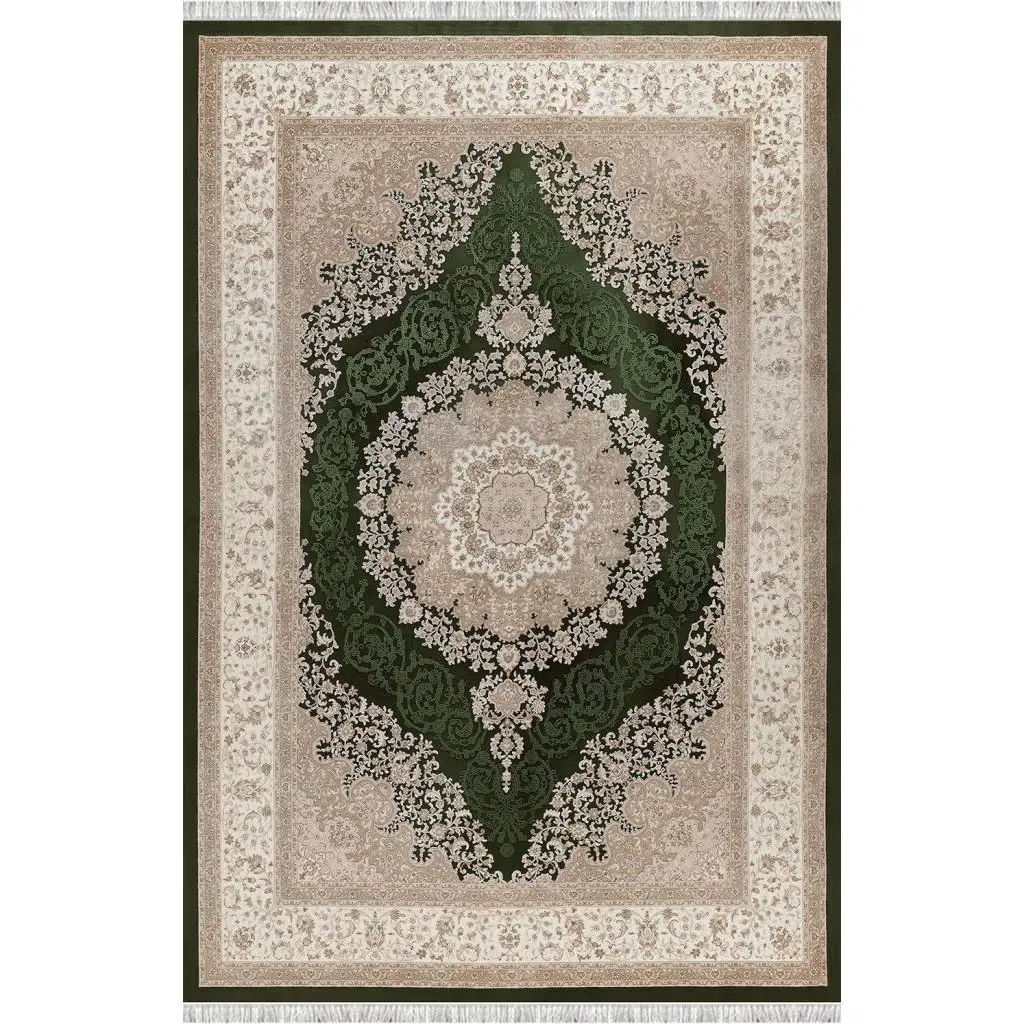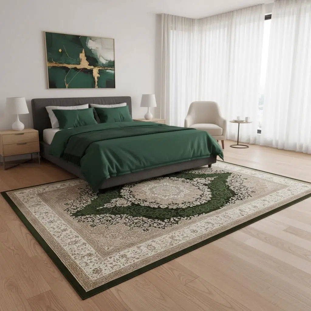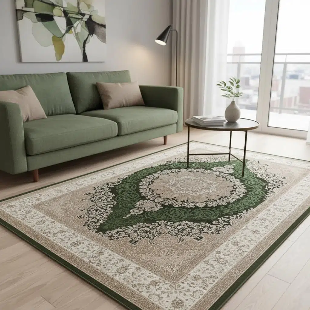 Klasik madalyonlu halı, doğal yeşil zemin rengi üzerine işlenen krem ve bej tonlarındaki zarif motifleriyle yaşam alanlarına huzurlu, dengeli ve sofistike bir atmosfer kazandırır. Merkezde yer alan detaylı madalyon deseni, klasik halı sanatının estetik çizgilerini güçlü ve uyumlu bir şekilde yansıtır. Derin yeşil zemin rengi, açık tonlu desenlerle kusursuz bir bütünlük oluşturarak mekâna doğallık ve ferahlık hissi katar. Açık renkli bordür detayı ise halının genel görünümünü tamamlayarak daha aydınlık ve dengeli bir algı oluşturur.
